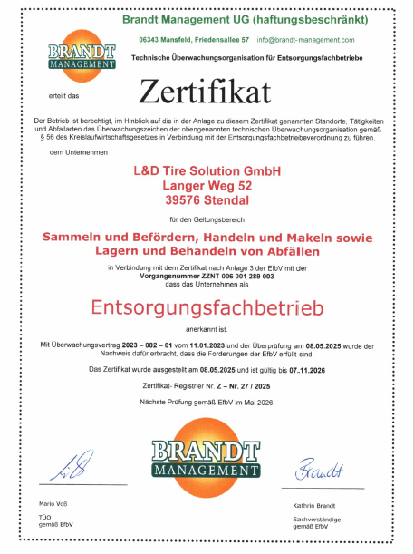 "Willkommen bei L & D Tire-Solution GmbH - Ihrem zertifizierten Entsorgungsbetrieb für Altreifen! Wir sind spezialisiert auf den Handel, das Makeln und die umweltfreundliche Entsorgung von Altreifen. Mit unserer langjährigen Erfahrung und unserem Engagement für Nachhaltigkeit bieten wir Ihnen professionelle Lösungen für die Entsorgung Ihrer Altreifen. Vertrauen Sie auf unsere Expertise und lassen Sie uns gemeinsam einen Beitrag zum Umweltschutz leisten. Besuchen Sie noch heute unsere Website und erfahren Sie mehr über unsere Dienstleistungen!"